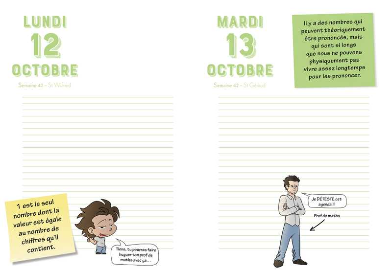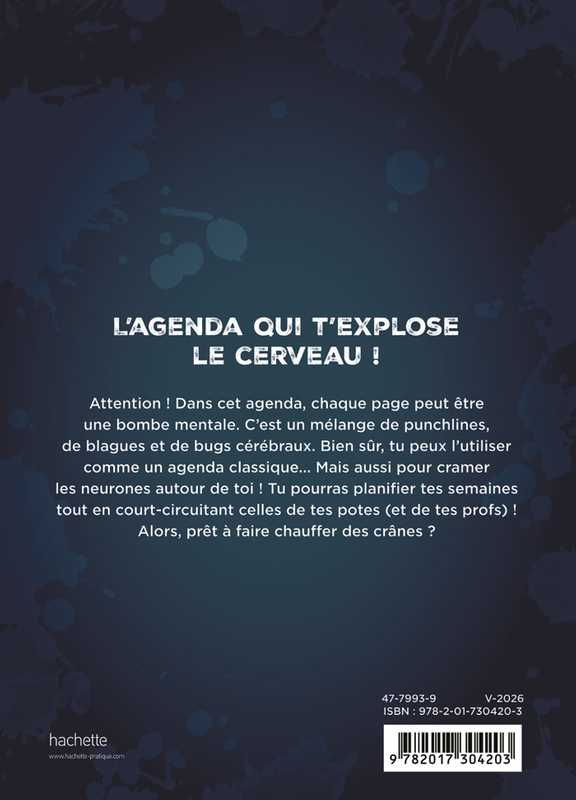 Attention ! Dans cet agenda, chaque page peut être une bombe mentale. C’est un mélange de punchlines, de blagues et de bugs cérébraux. Bien sûr, tu peux l’utiliser comme un agenda classique... Mais aussi pour cramer les neurones autour de toi ! Tu pourras planifier tes semaines tout en court-circuitant celles de tes potes (et de tes profs) !