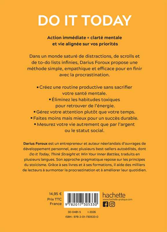 - Dans un monde saturé de distractions, de scrolls et de to-do lists infinies, Darius Foroux propose une méthode simple, empathique et efficace pour en finir avec la procrastination.