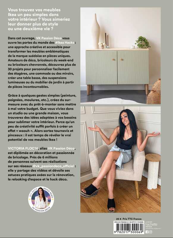 Grâce à quelques gestes simples (peinture, poignées, moulures, etc.), créez du surmesure avec du prêt-à-monter sans mettre à mal votre budget. Que vous viviez dans un studio ou une grande maison, vous trouverez des idées adaptées à vos besoins pour sublimer votre intérieur. Parce qu’un peu de créativité suffit parfois à créer un effet « waouh ». Alors sortez tournevis et pinceaux : il est temps de révéler le vrai potentiel de vos meubles Ikea ! VICTORIA FLOC’H, alias VK Passion Déco, est diplômée en décoration et passionnée de bricolage. Près de 6 millions de personnes suivent ses réalisations sur ses réseaux @vk_passiondeco_officiel : elle y partage des vidéos et dévoile ses astuces pratiques axées sur la rénovation, le relooking d’espace et le hack déco.