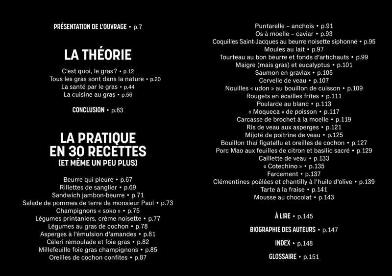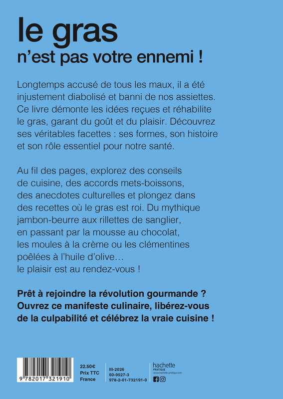Au fil des pages, explorez des conseils de cuisine, des accords mets-boissons, des anecdotes culturelles et plongez dans des recettes où le gras est roi. Du mythique jambon-beurre aux rillettes de sanglier, en passant par la mousse au chocolat, les moules à la crème ou les clémentines poêlées à l’huile d’olive… le plaisir est au rendez-vous !