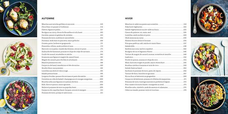 et sashimi de thon, etc. - En hiver : Pommes de terre, harengs marinés et paillettes d’algues, Endives au noix, lard et roquefort, Salade thaïe au boeuf, etc.