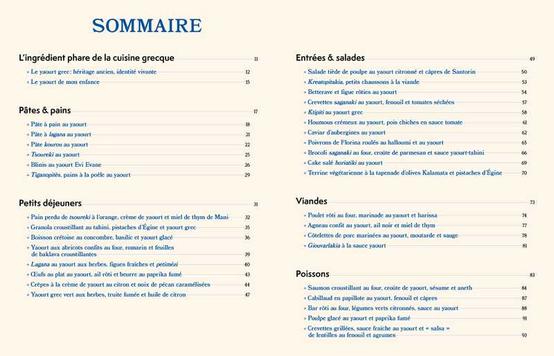 Tzatzikis traditionnel et à la betterave, Salade tiède de poulpe au yaourt citronné et câpres de Santorin, Bar rôti au four, légumes verts citronnés, sauce au yaourt, Agneau confit au yaourt, ail noir et miel de thym, Pâtes fraîches à la crème de yaourt, citron et basilic, Baklava glacé à la crème de yaourt et fraises, Poires pochées au vin rouge, mousse de yaourt à la vanille, Koulourakia, petits biscuits à la vanille au yaourt…